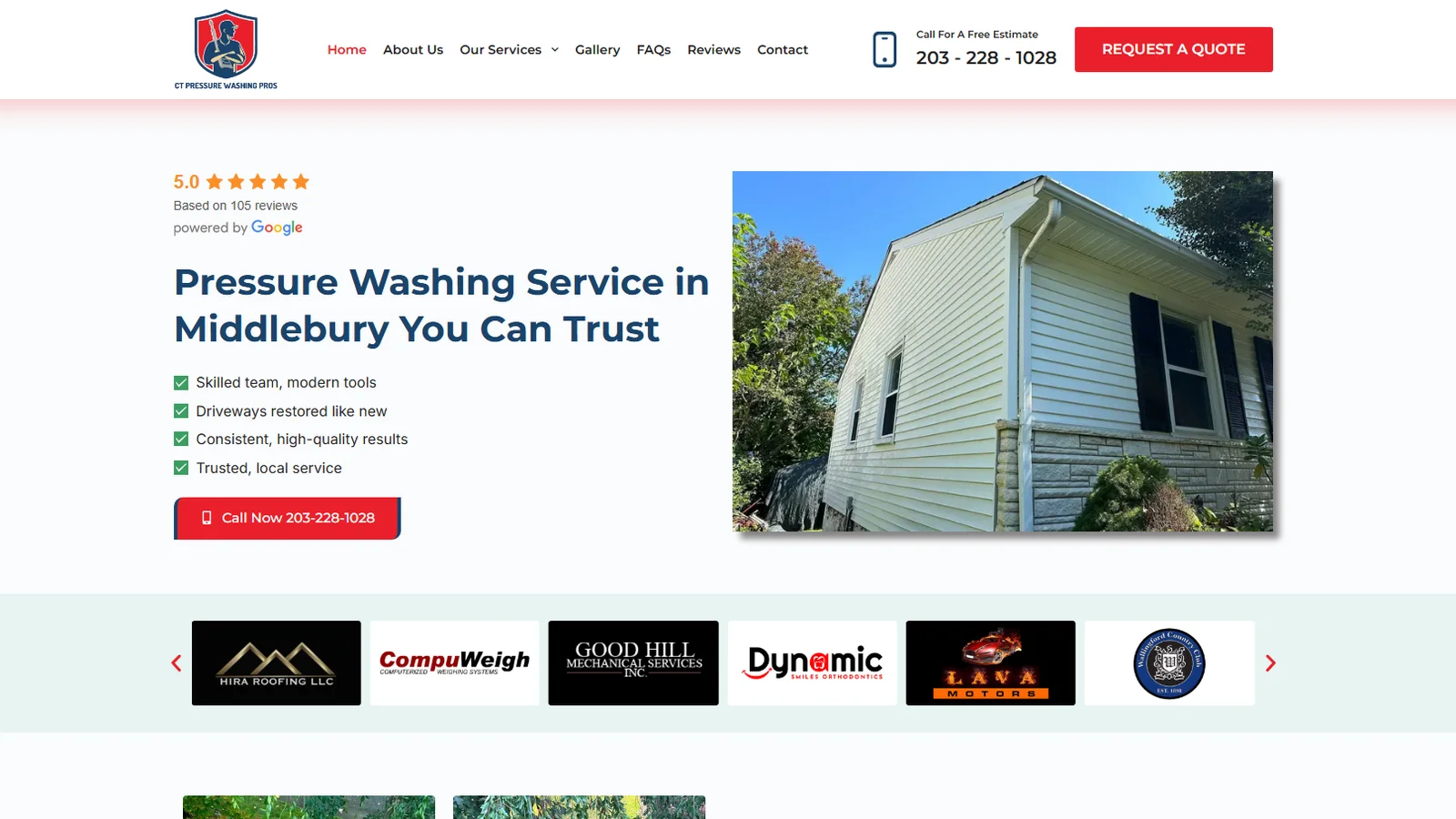 A custom WordPress website built for a local pressure washing service offering residential and commercial cleaning solutions.