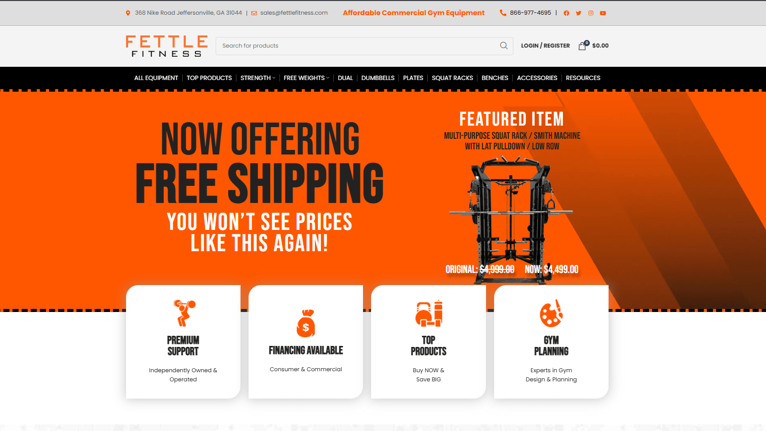 WordPress website for a fitness equipment brand offering affordable, high-quality commercial gym gear across all gym sizes.